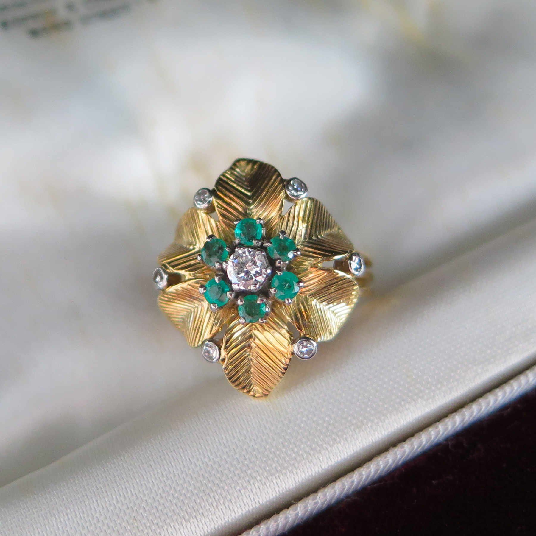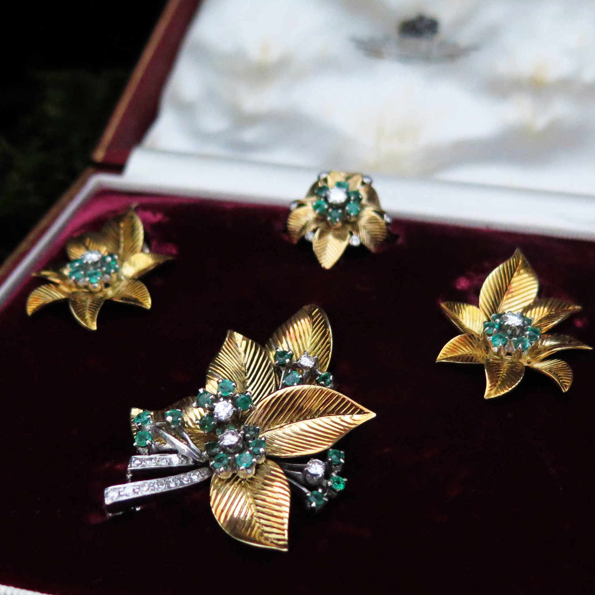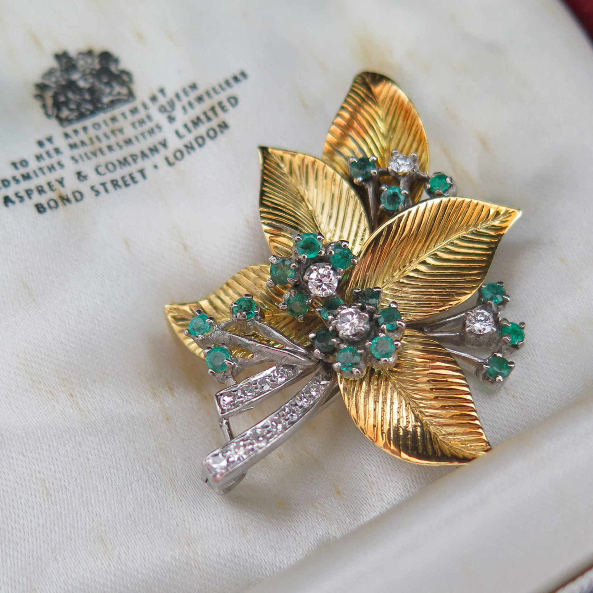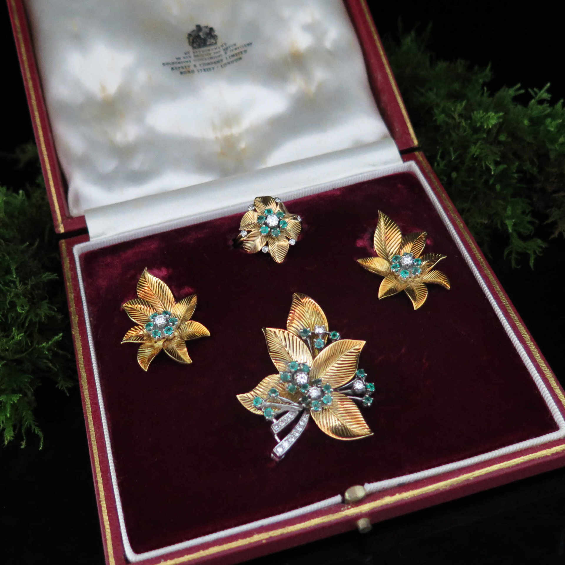 A fine suite of jewels by Asprey & Co, comprising a brooch, earrings and ring. The brooch is designed as a stylised foliate spray of textured gold leaves with flowerhead clusters of emeralds and diamonds. The earrings and ring of matching design. Beautifully modelled in 18ct yellow gold. Supplied in the original fitted box by Asprey and Co.