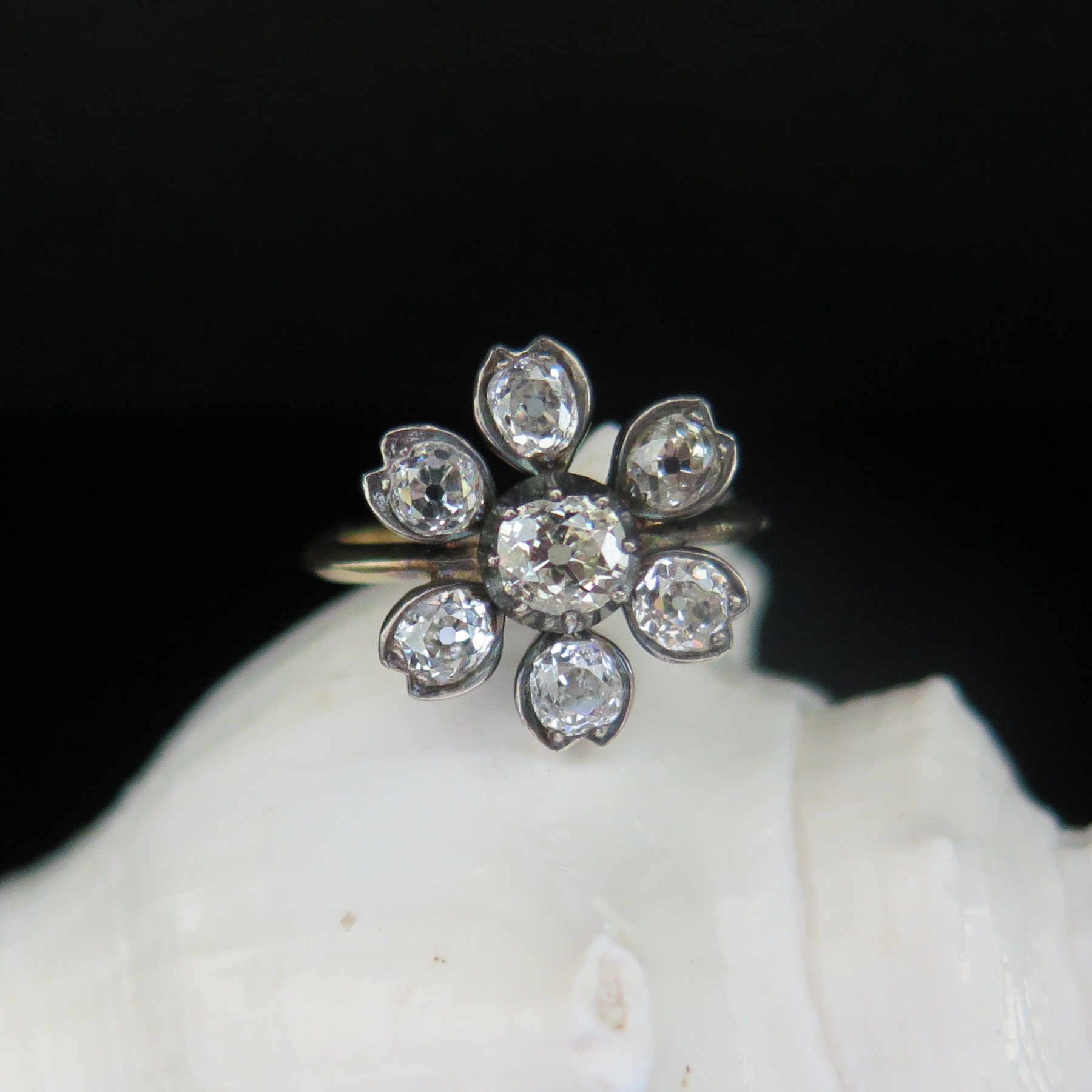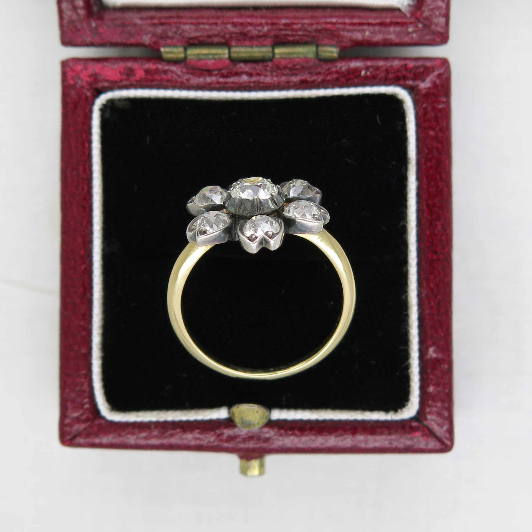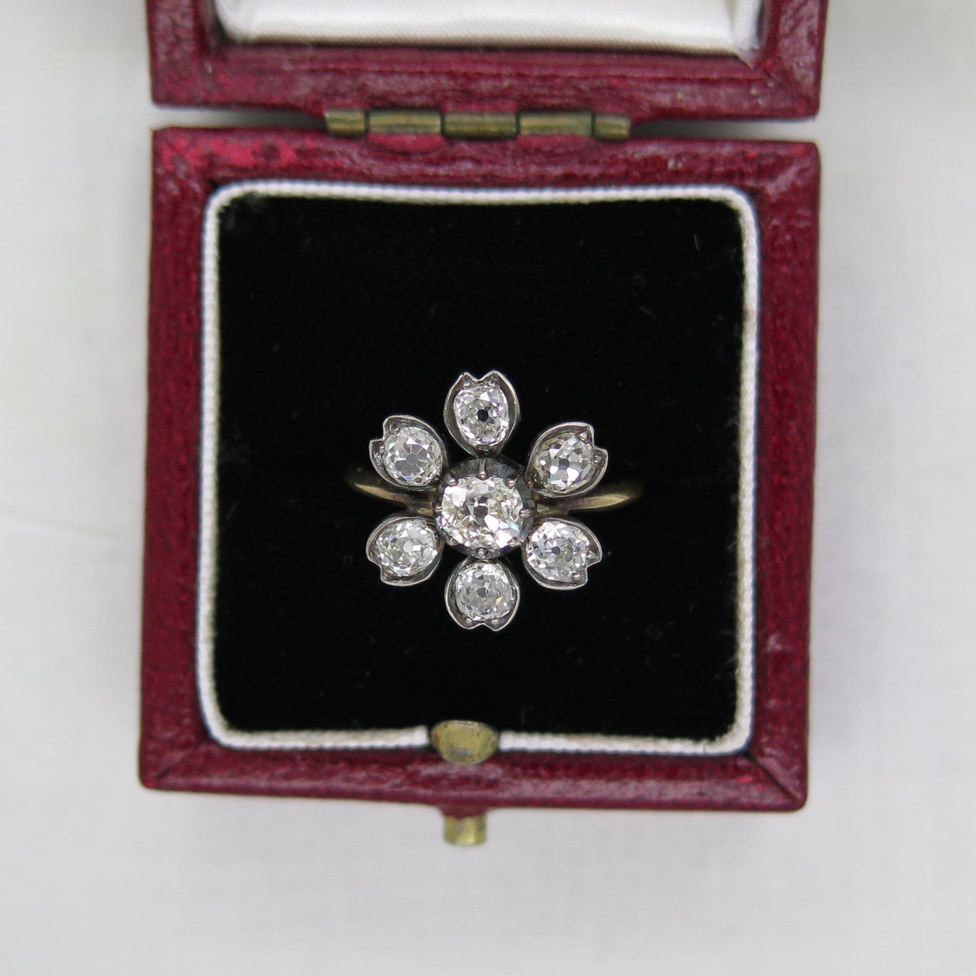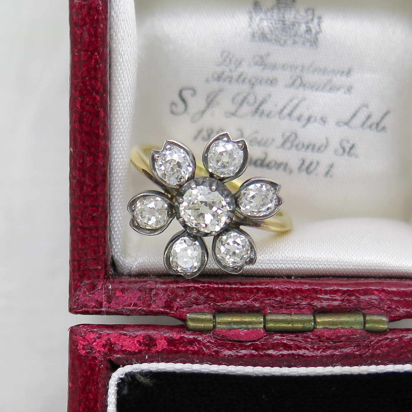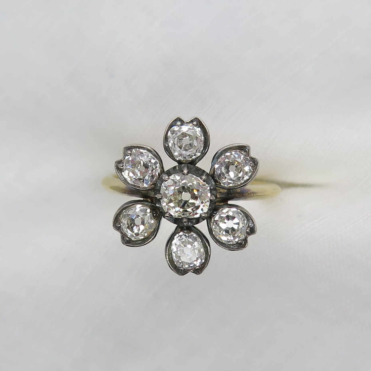 A delightful diamond cluster ring modelled as a flowerhead, the stamen set with a beautiful old mine-cut diamond pinch collet-set, within a surround of six smaller similarly-cut diamonds forming the petals. Mounted in silver, typical of the Victorian period and 18ct yellow gold, supplied in a tooled leather box by S. J. Phillips of Bond St.
